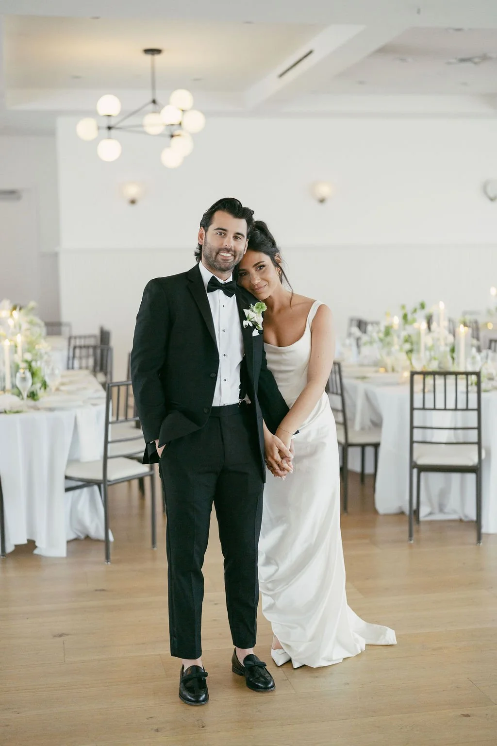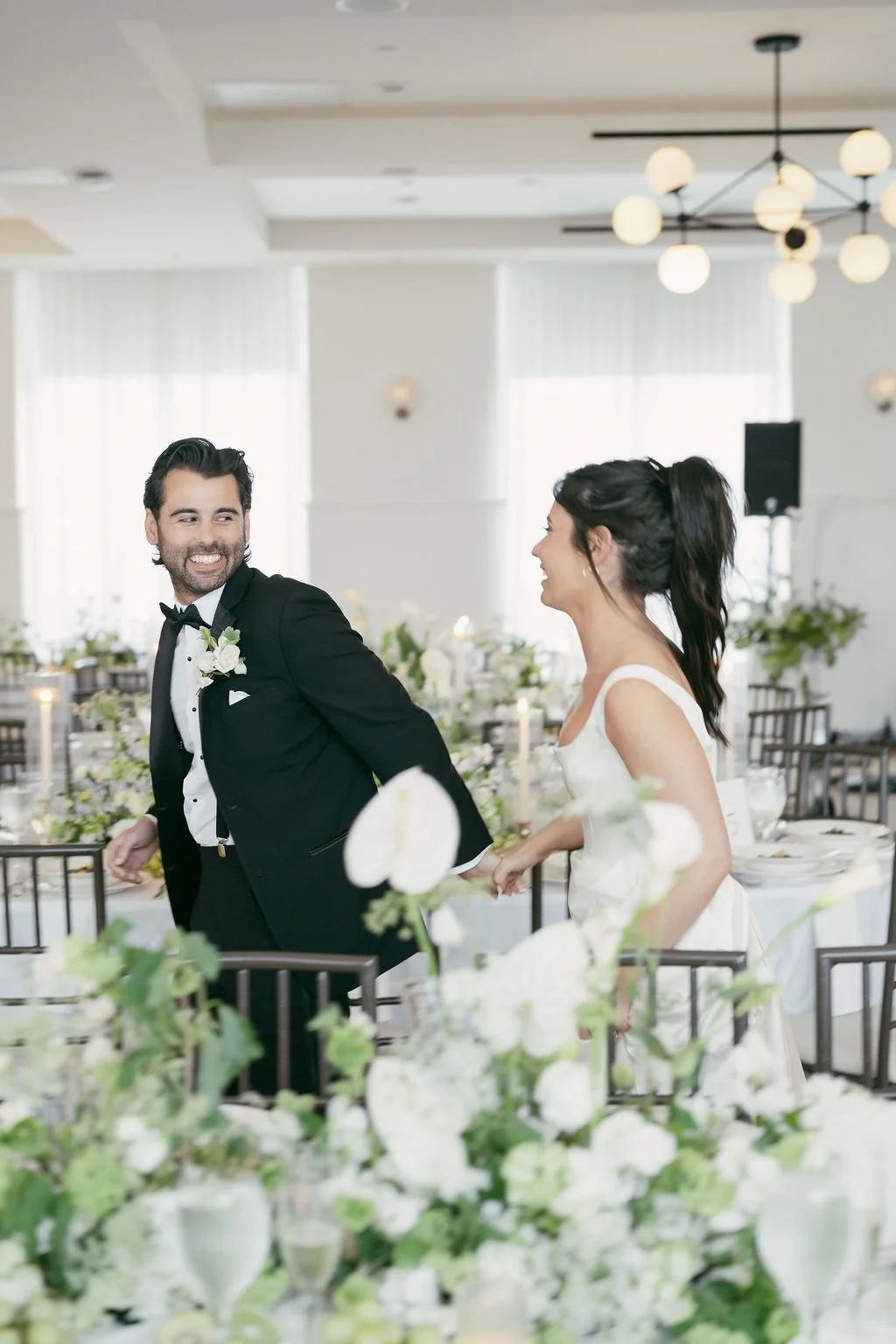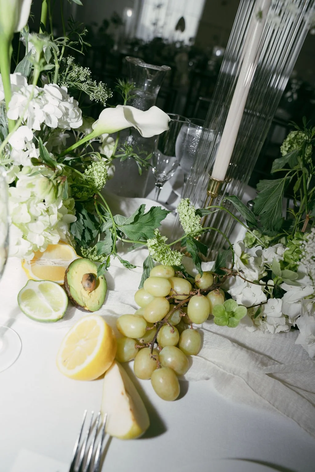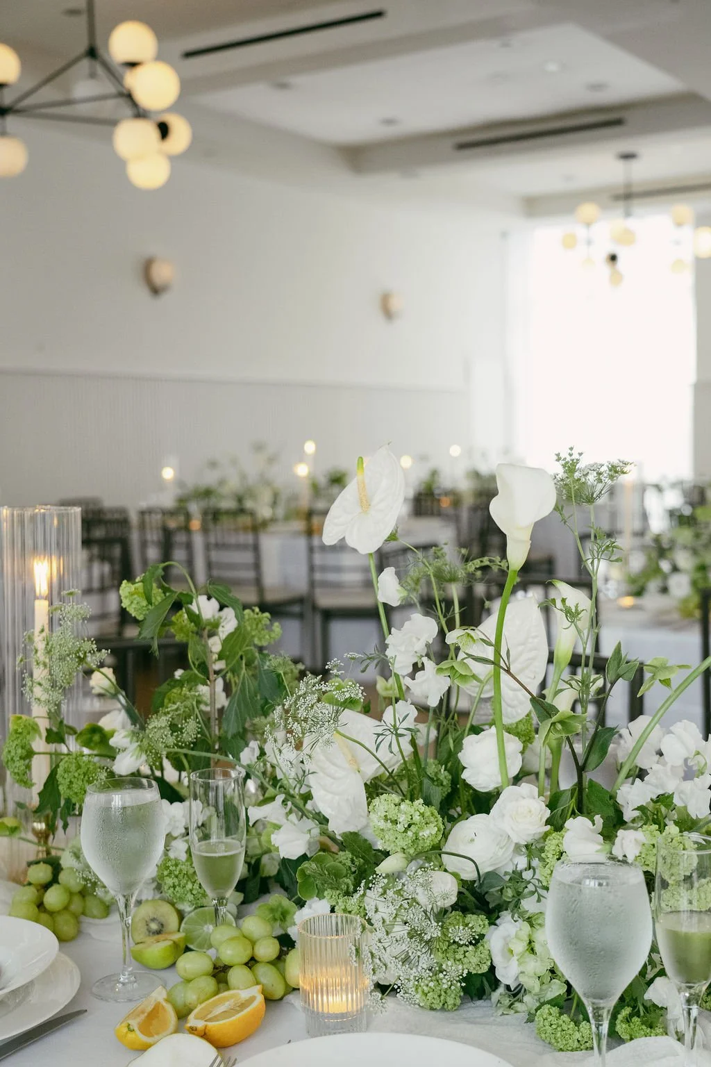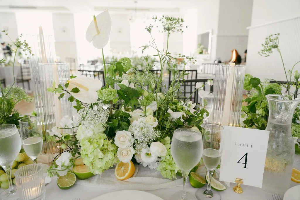 The couple’s wedding day was a study in modern elegance, with a neutral palette of black, white, and lush greenery creating a timeless backdrop. Tables were accented with fresh fruit elements, adding subtle pops of color and texture throughout the space. The day included stunning bridal portraits that captured the couple’s effortless style, and a surprise visit from their beloved puppy added a playful, personal touch. Minimalist design, thoughtful details, and heartfelt moments combined for a celebration that felt both chic and intimately joyful.