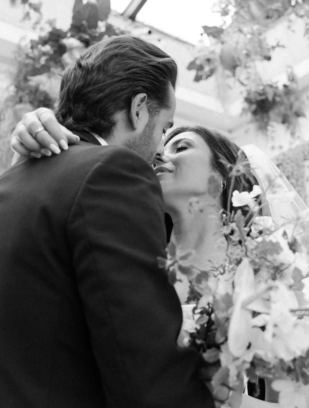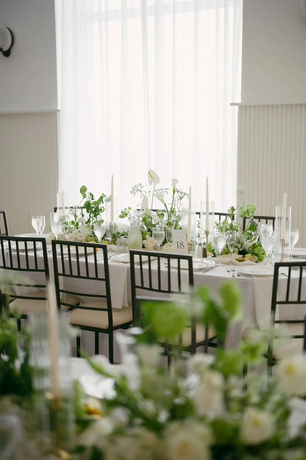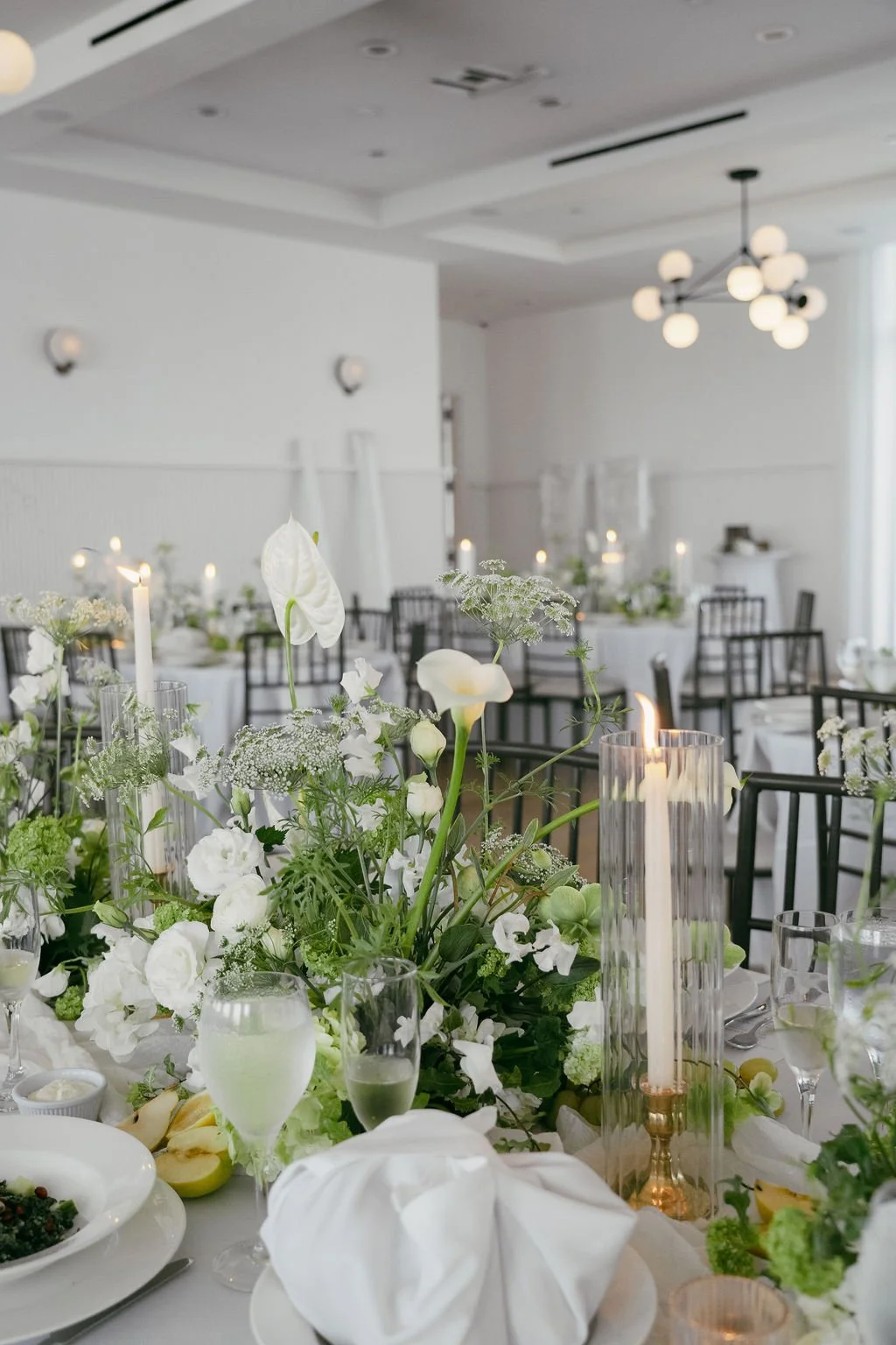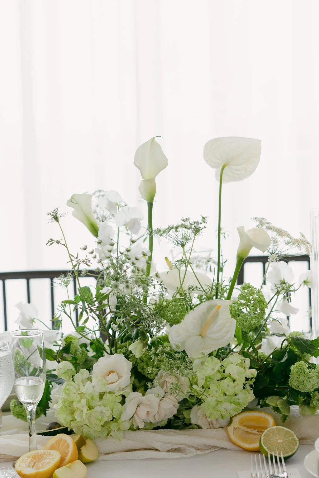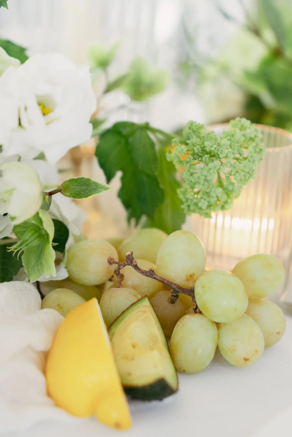 The couple’s wedding day was a study in modern elegance, with a neutral palette of black, white, and lush greenery creating a timeless backdrop. Tables were accented with fresh fruit elements, adding subtle pops of color and texture throughout the space. The day included stunning bridal portraits that captured the couple’s effortless style, and a surprise visit from their beloved puppy added a playful, personal touch. Minimalist design, thoughtful details, and heartfelt moments combined for a celebration that felt both chic and intimately joyful.