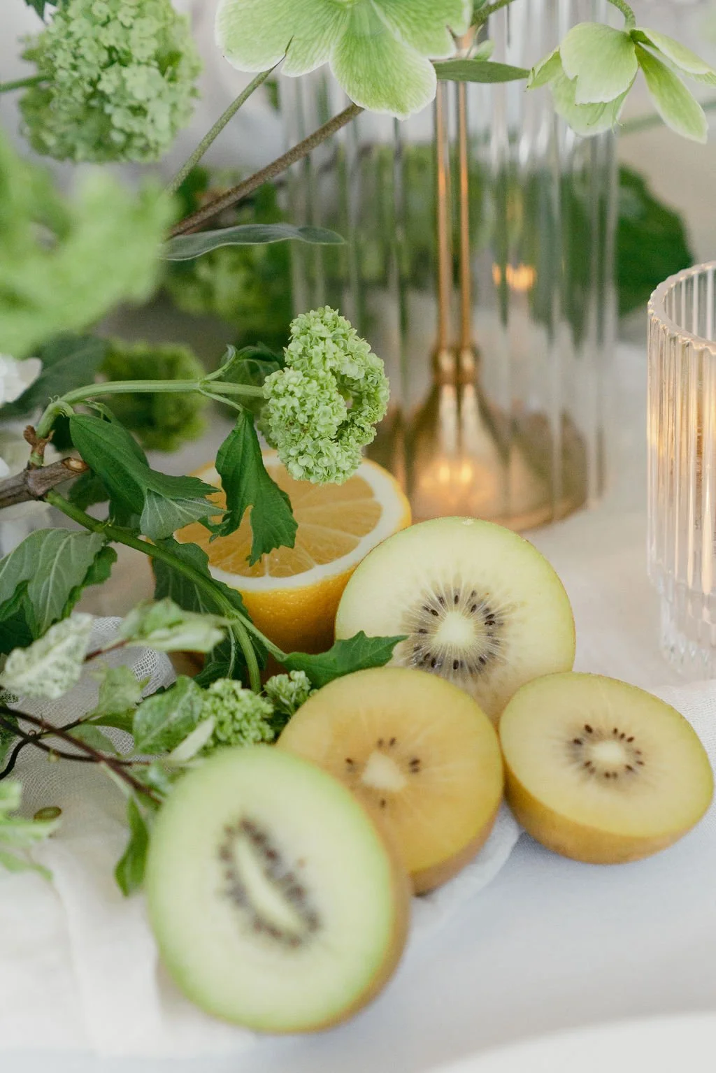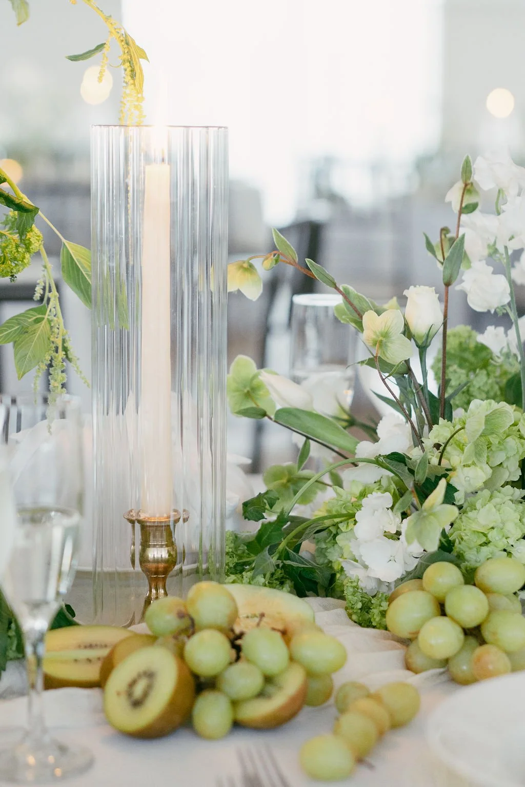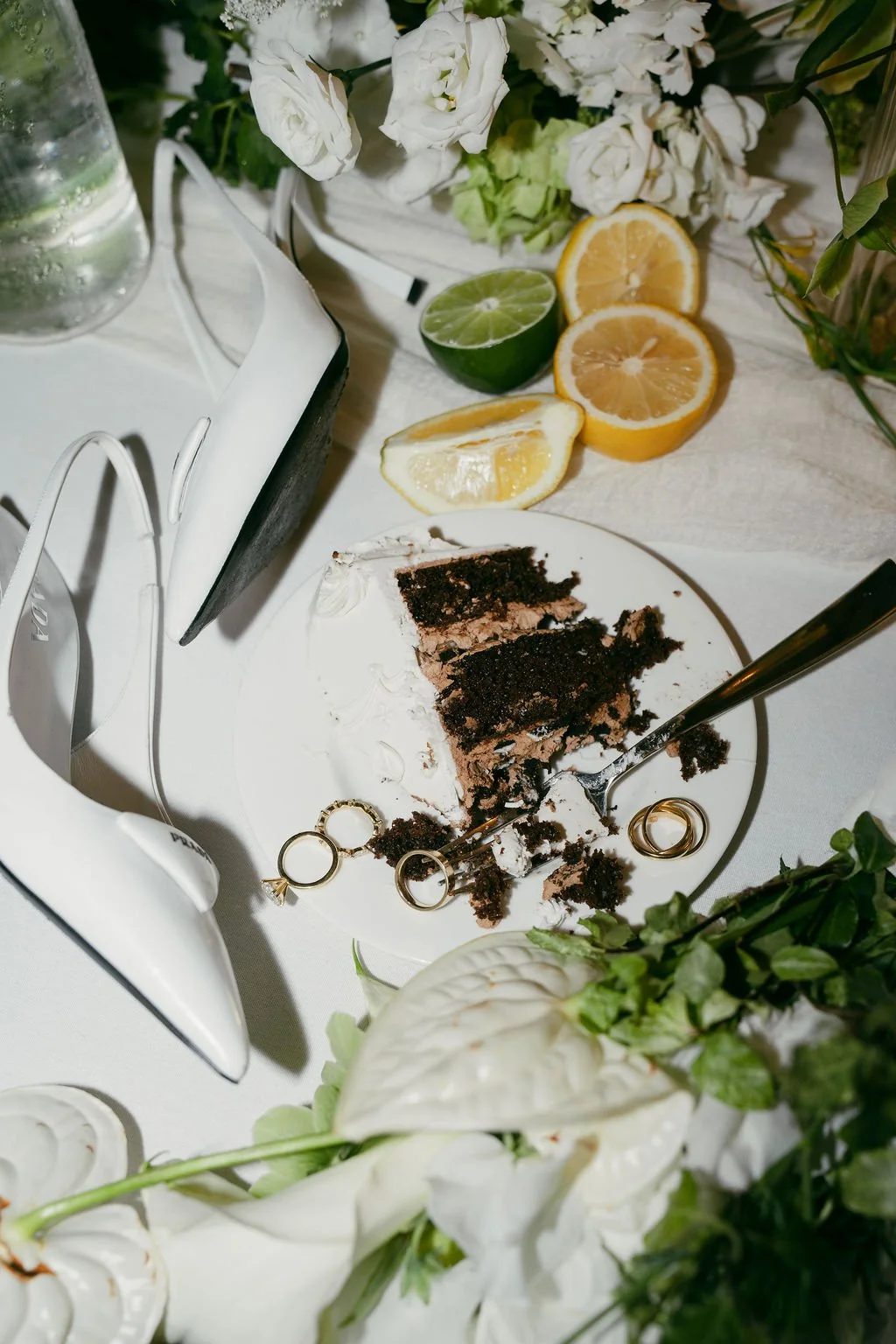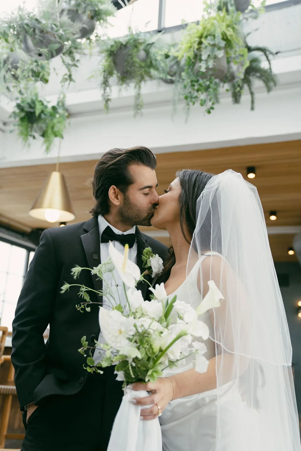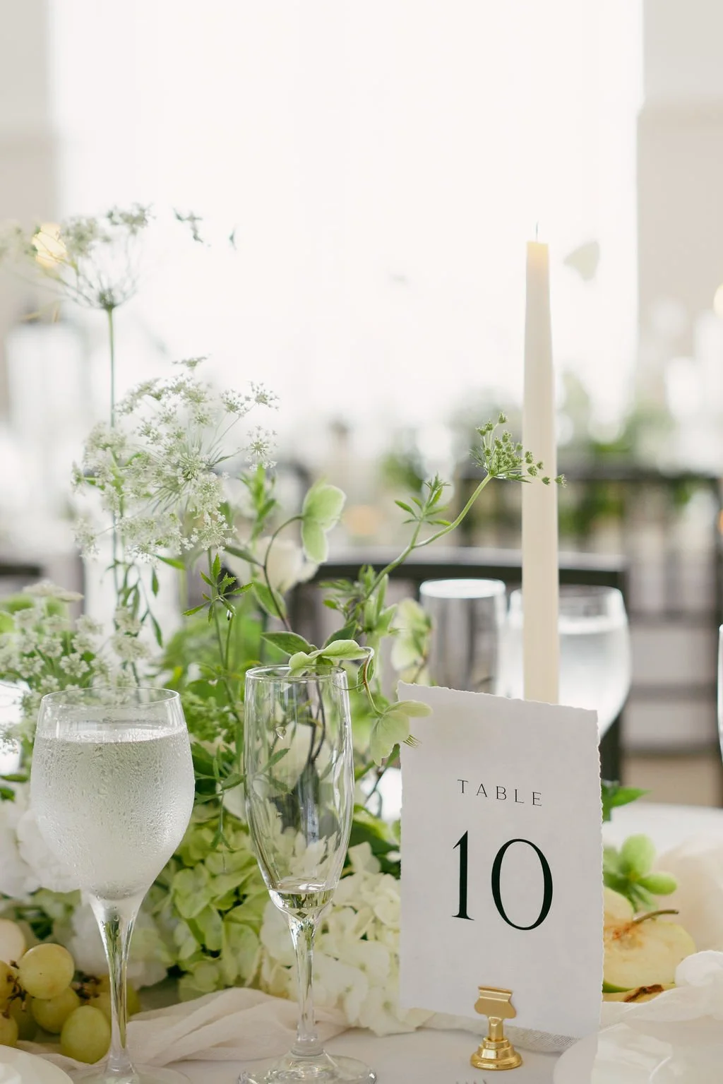 The couple’s wedding day was a study in modern elegance, with a neutral palette of black, white, and lush greenery creating a timeless backdrop. Tables were accented with fresh fruit elements, adding subtle pops of color and texture throughout the space. The day included stunning bridal portraits that captured the couple’s effortless style, and a surprise visit from their beloved puppy added a playful, personal touch. Minimalist design, thoughtful details, and heartfelt moments combined for a celebration that felt both chic and intimately joyful.