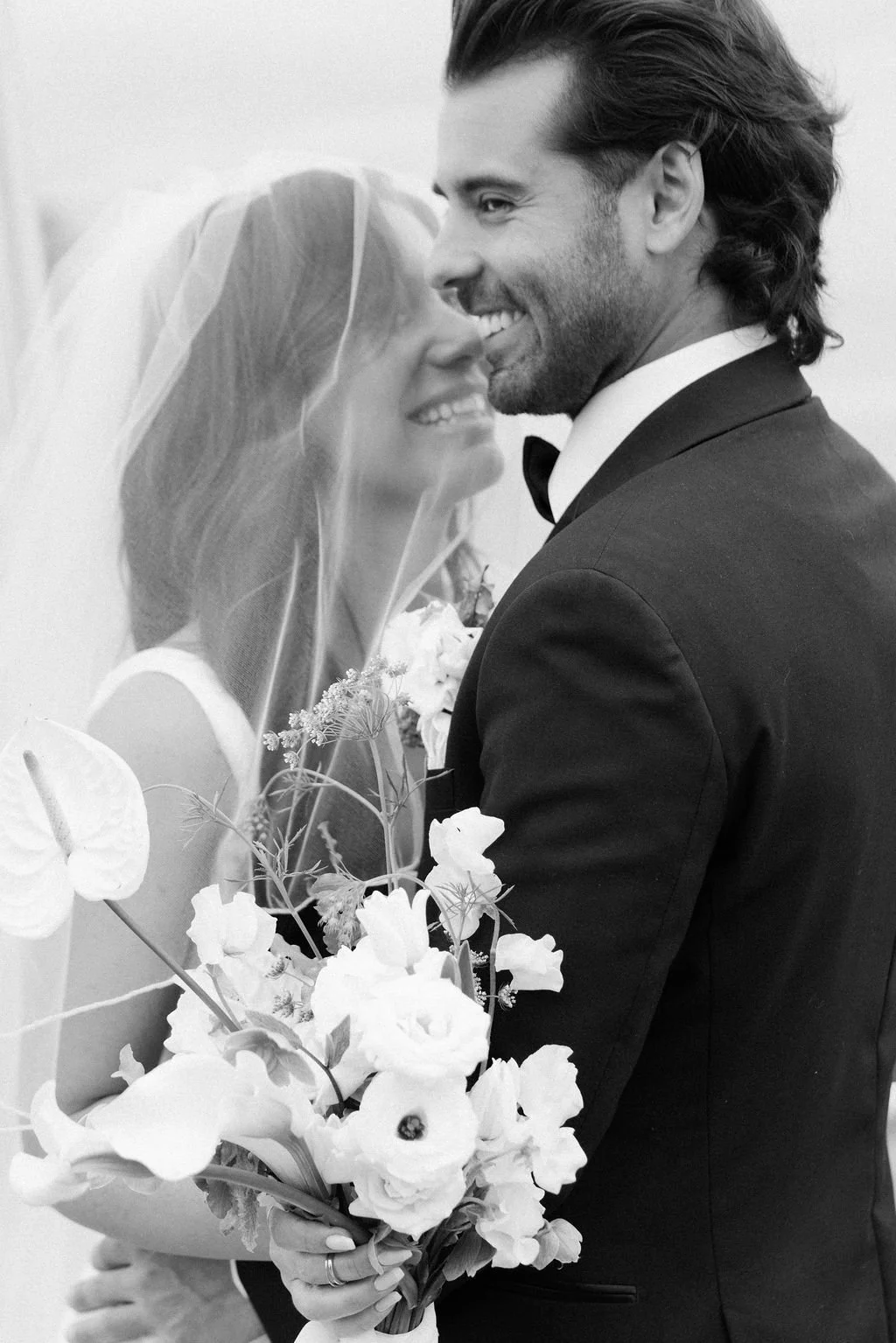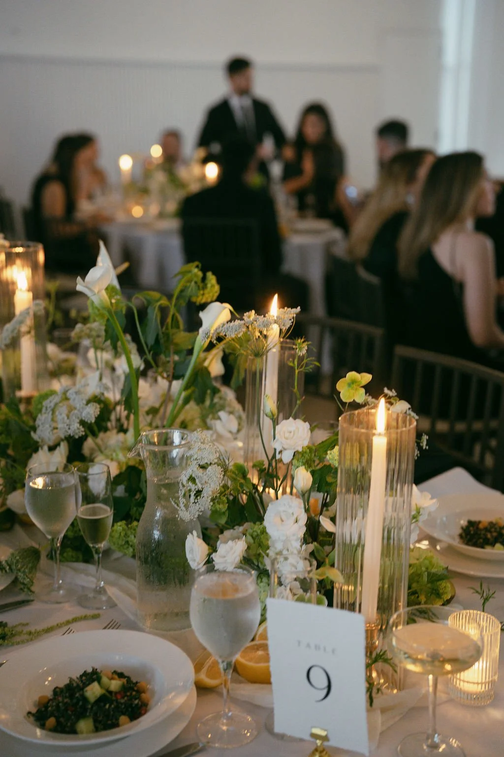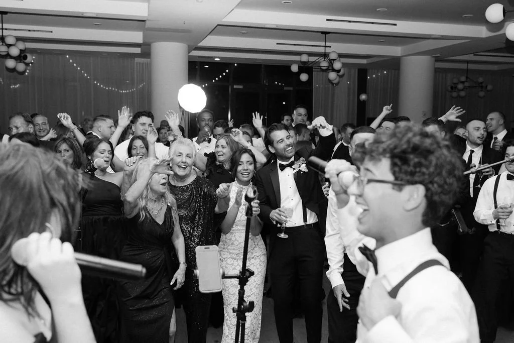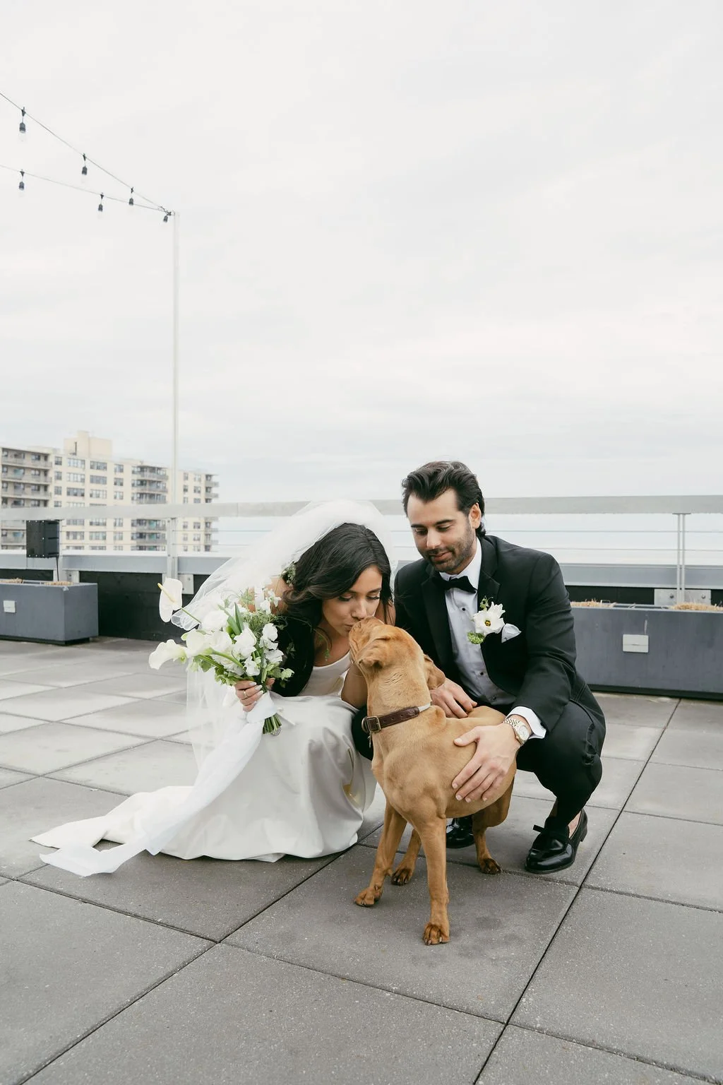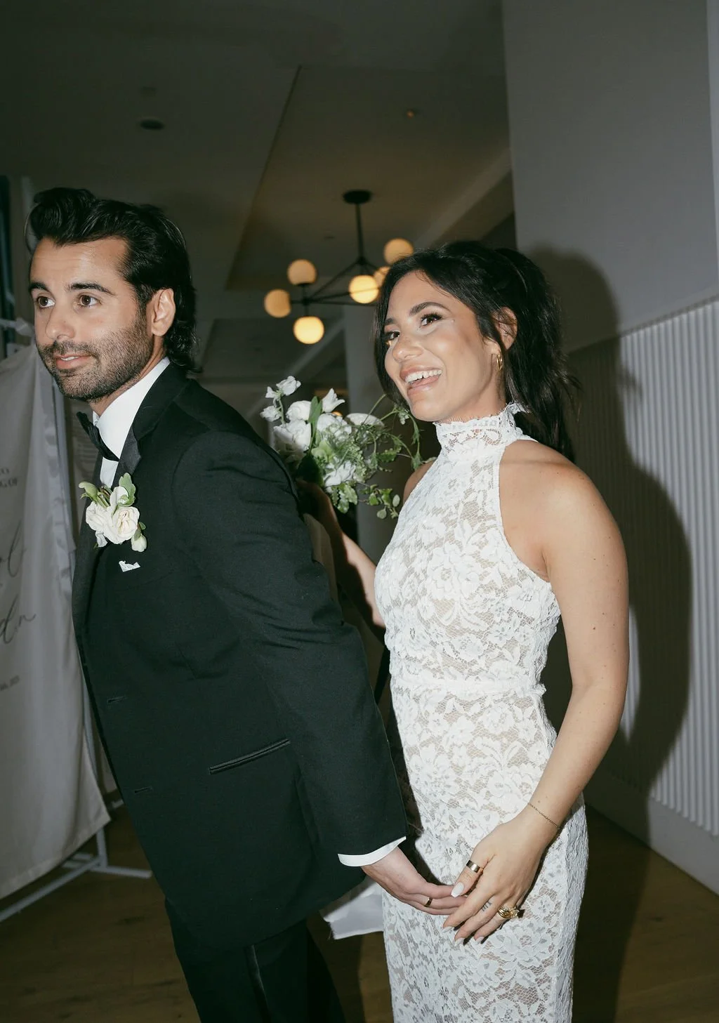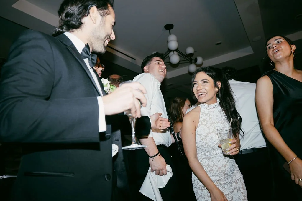 The couple’s wedding day was a study in modern elegance, with a neutral palette of black, white, and lush greenery creating a timeless backdrop. Tables were accented with fresh fruit elements, adding subtle pops of color and texture throughout the space. The day included stunning bridal portraits that captured the couple’s effortless style, and a surprise visit from their beloved puppy added a playful, personal touch. Minimalist design, thoughtful details, and heartfelt moments combined for a celebration that felt both chic and intimately joyful.