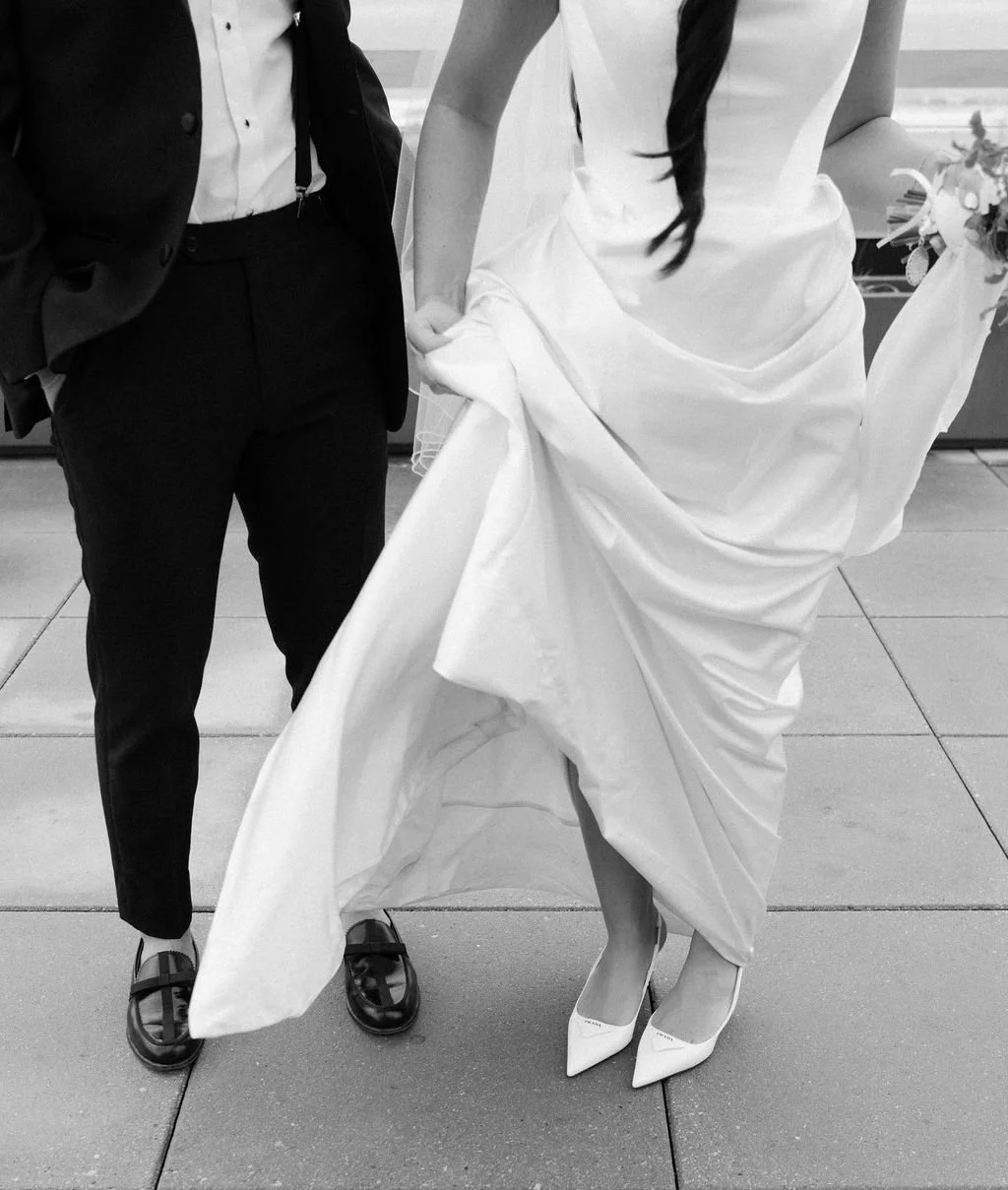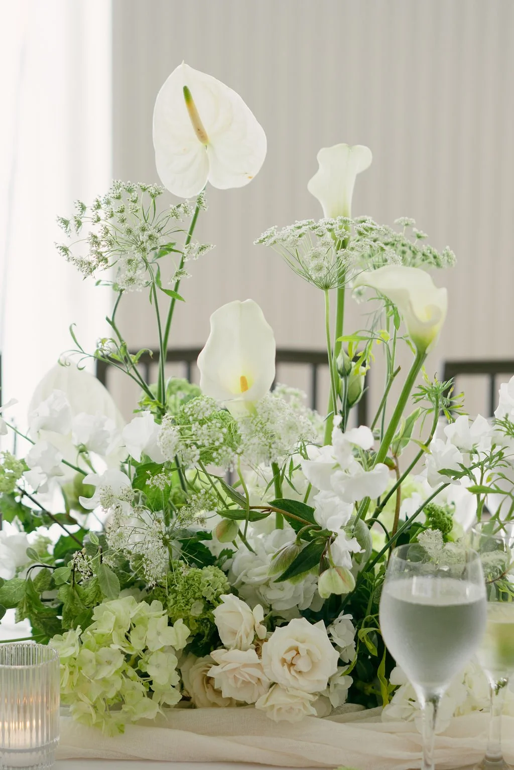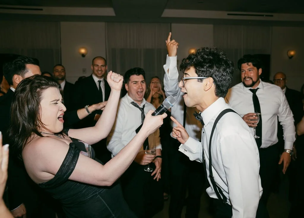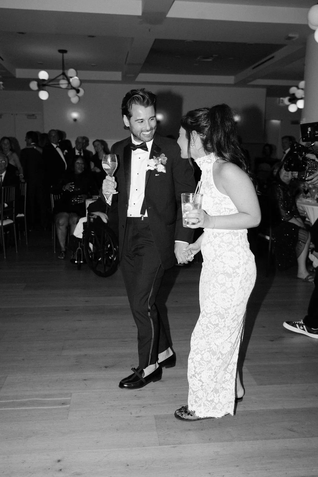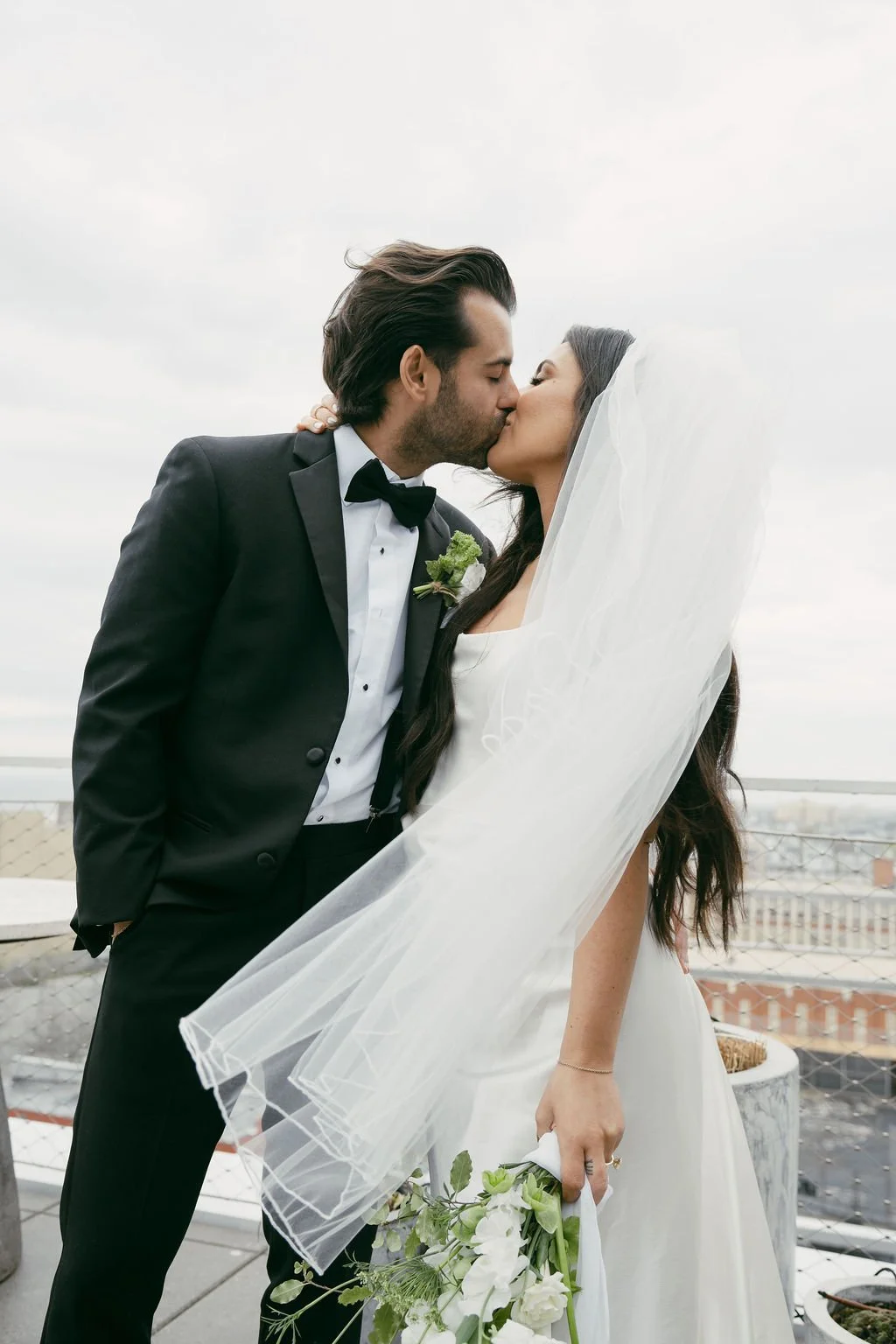 The couple’s wedding day was a study in modern elegance, with a neutral palette of black, white, and lush greenery creating a timeless backdrop. Tables were accented with fresh fruit elements, adding subtle pops of color and texture throughout the space. The day included stunning bridal portraits that captured the couple’s effortless style, and a surprise visit from their beloved puppy added a playful, personal touch. Minimalist design, thoughtful details, and heartfelt moments combined for a celebration that felt both chic and intimately joyful.