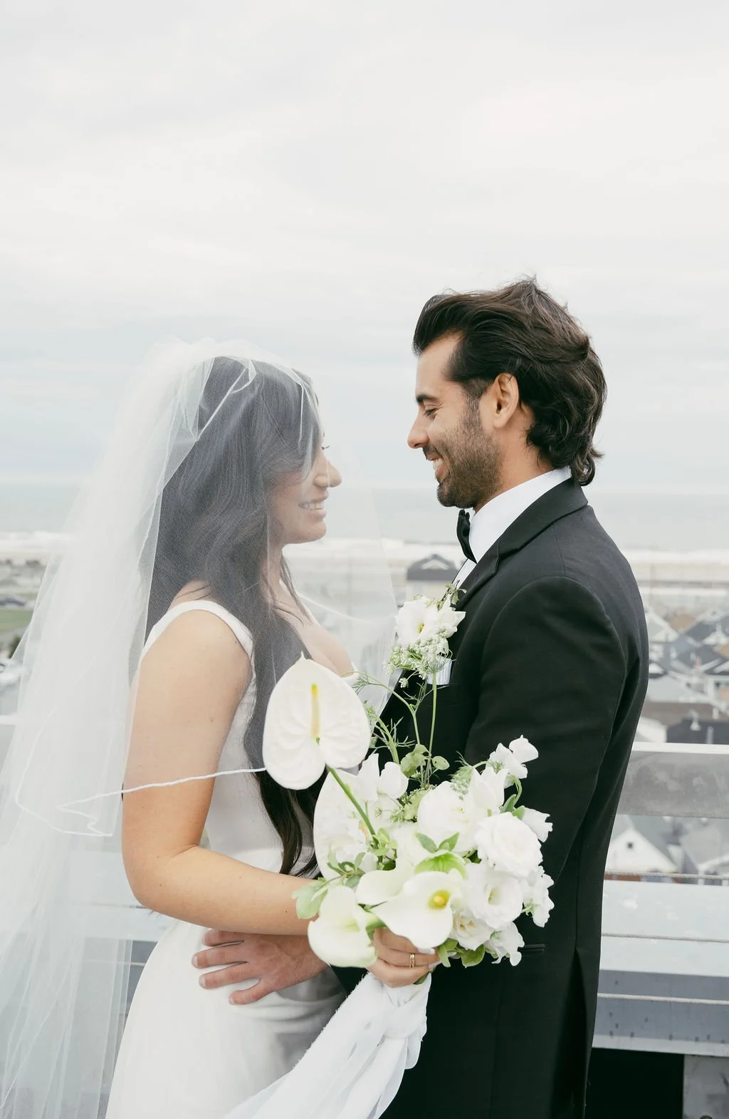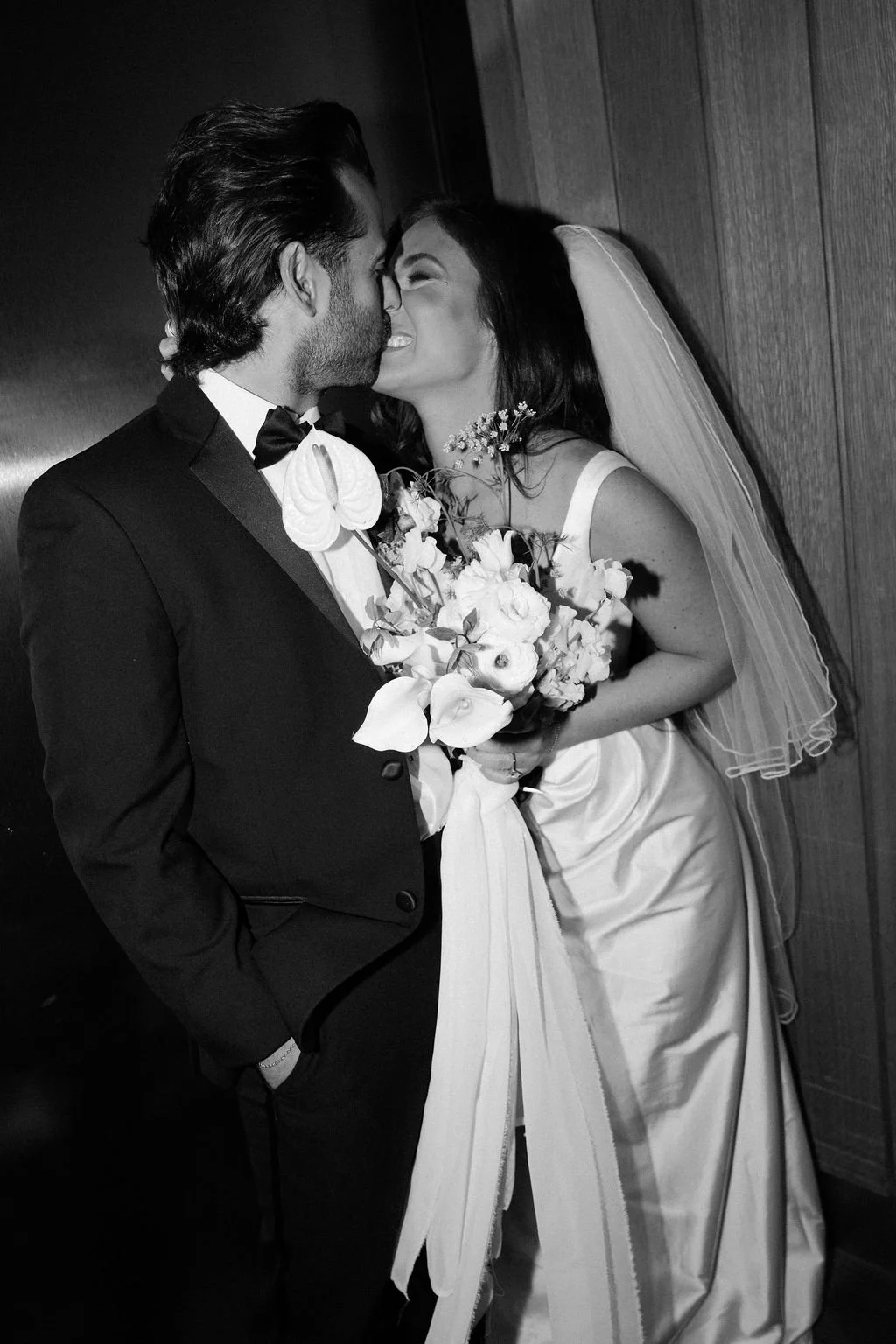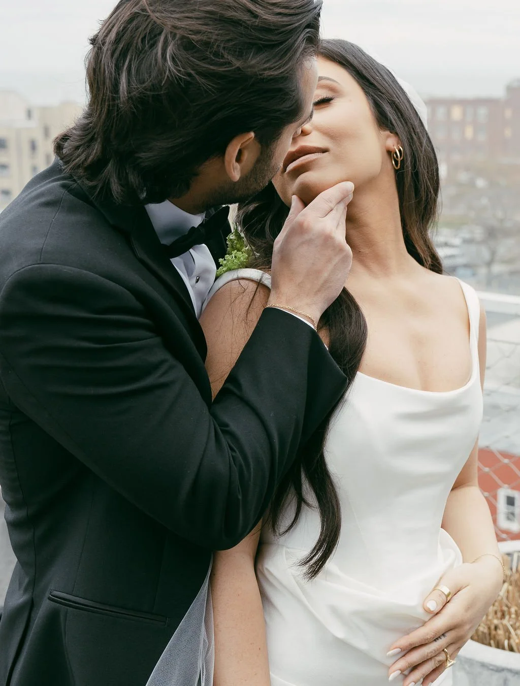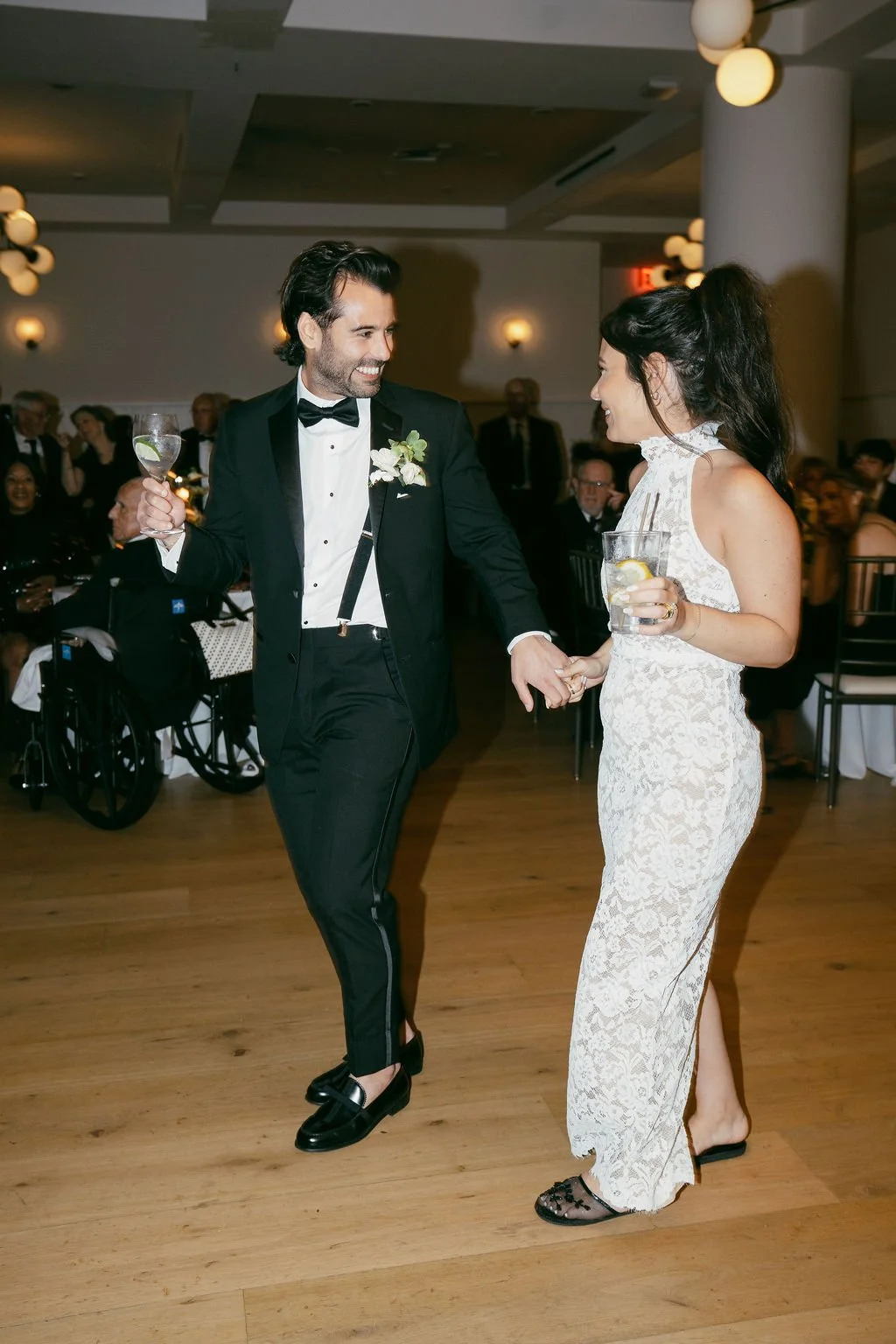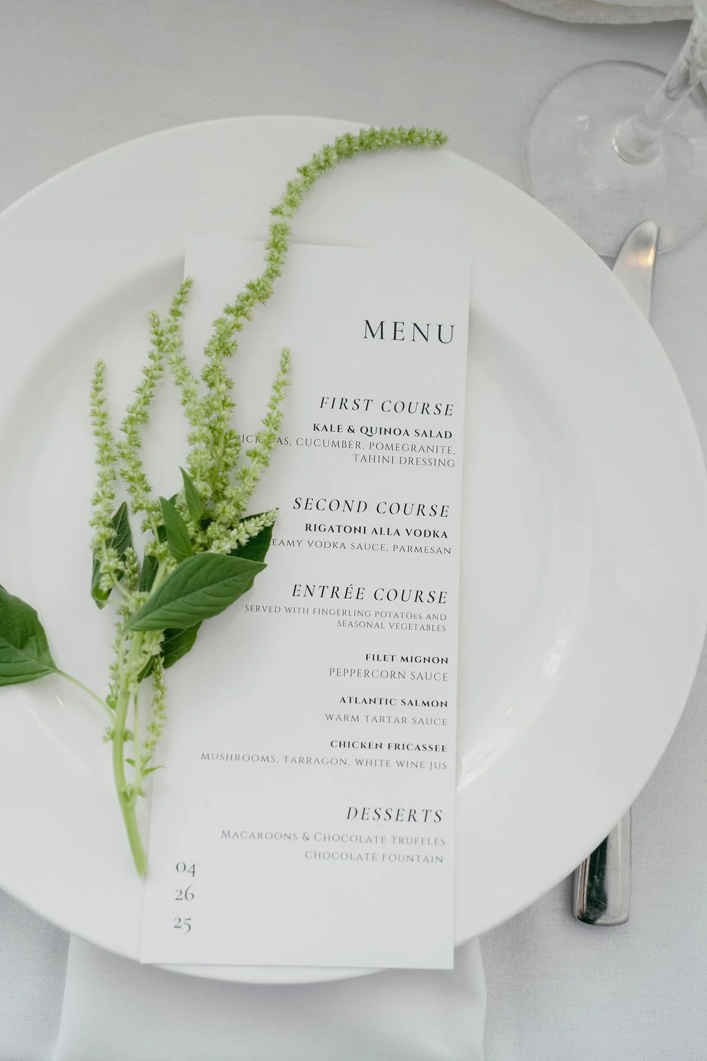 The couple’s wedding day was a study in modern elegance, with a neutral palette of black, white, and lush greenery creating a timeless backdrop. Tables were accented with fresh fruit elements, adding subtle pops of color and texture throughout the space. The day included stunning bridal portraits that captured the couple’s effortless style, and a surprise visit from their beloved puppy added a playful, personal touch. Minimalist design, thoughtful details, and heartfelt moments combined for a celebration that felt both chic and intimately joyful.