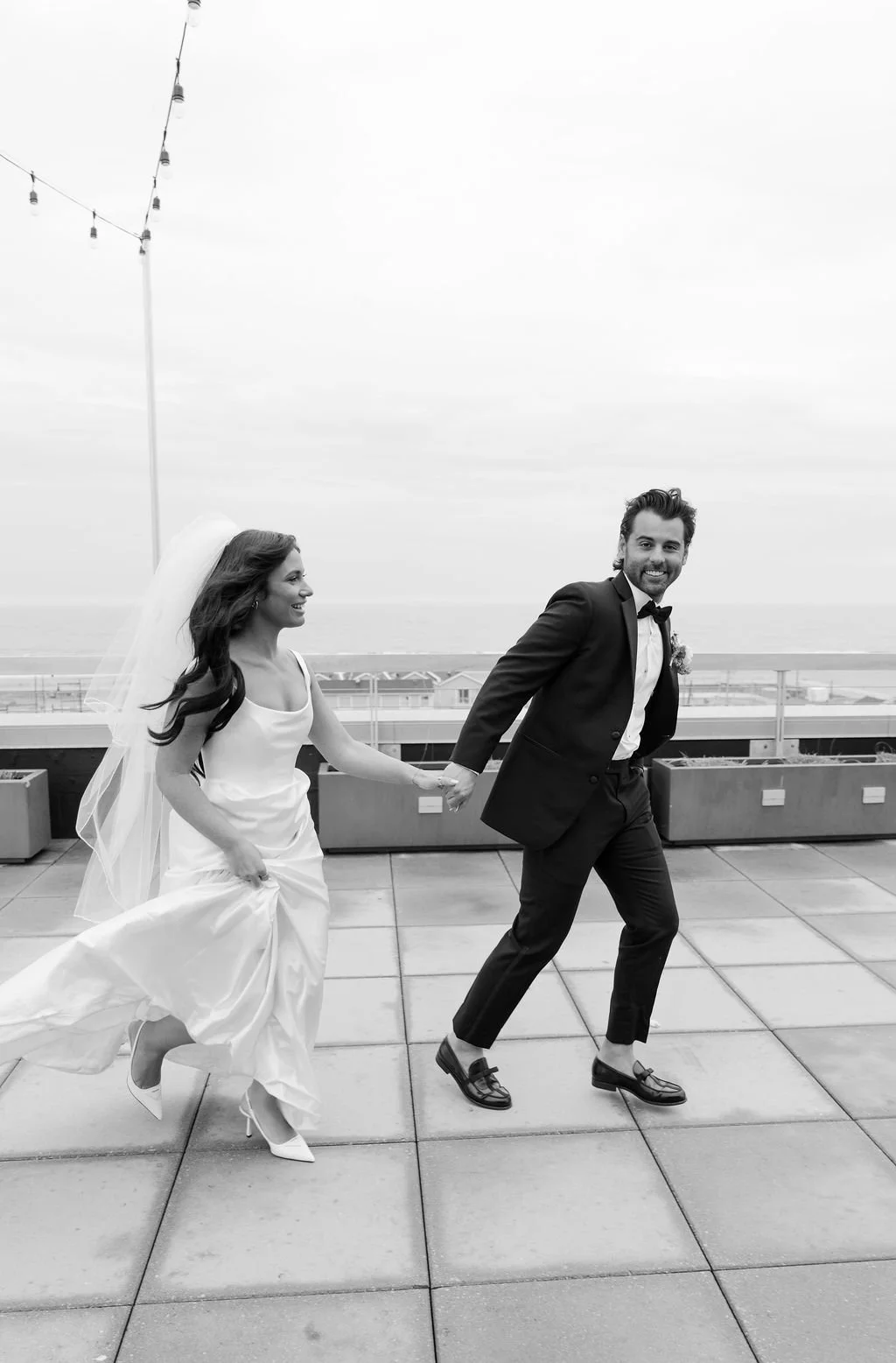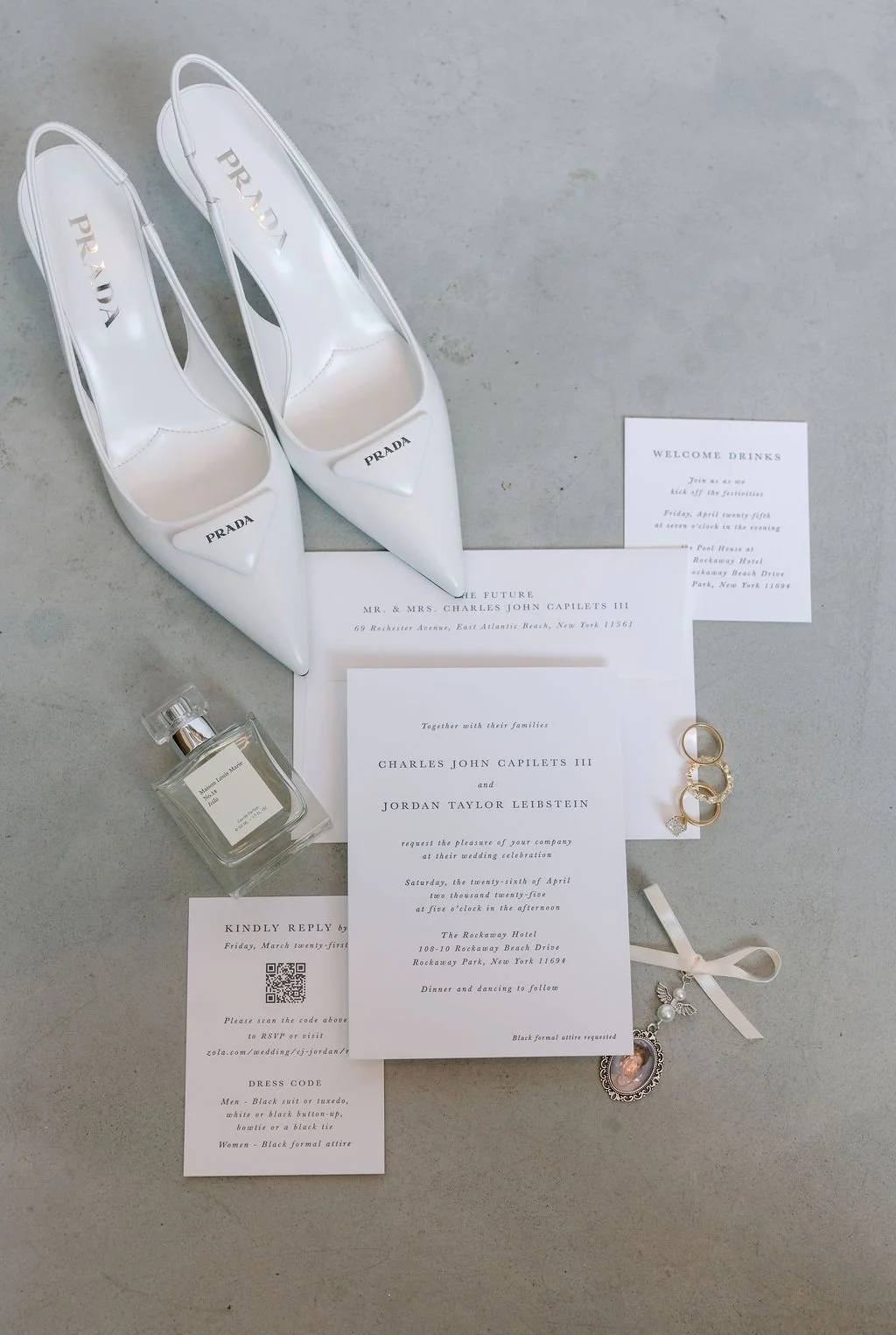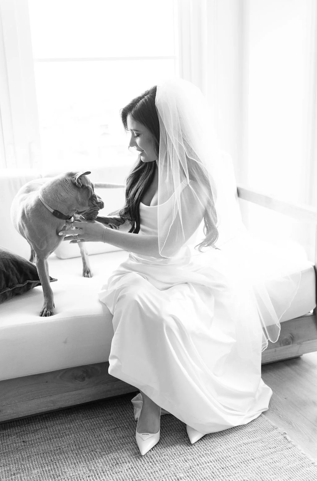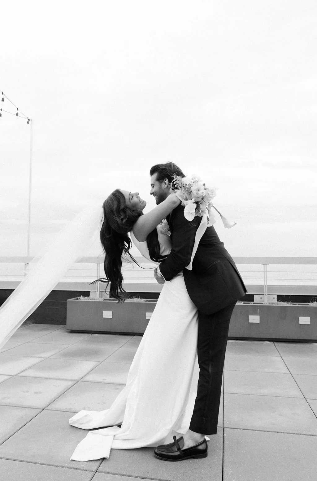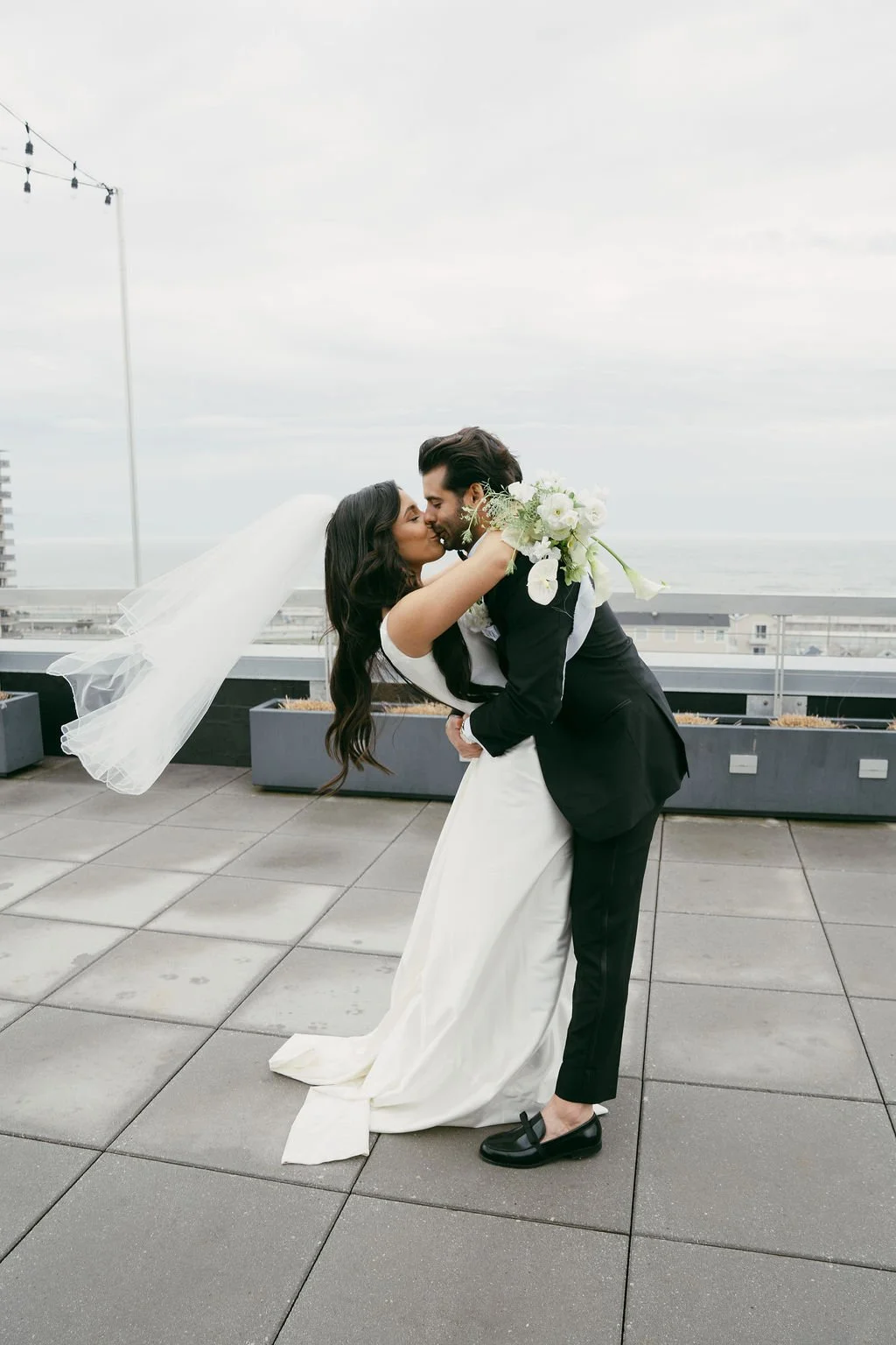 The couple’s wedding day was a study in modern elegance, with a neutral palette of black, white, and lush greenery creating a timeless backdrop. Tables were accented with fresh fruit elements, adding subtle pops of color and texture throughout the space. The day included stunning bridal portraits that captured the couple’s effortless style, and a surprise visit from their beloved puppy added a playful, personal touch. Minimalist design, thoughtful details, and heartfelt moments combined for a celebration that felt both chic and intimately joyful.